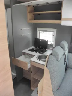 - Gourmet-Küche: 2-Flamm-Kocher, großzügige Schubladen, Besteckeinsatz, Abfalleimer und großzügige Arbeitsfläche